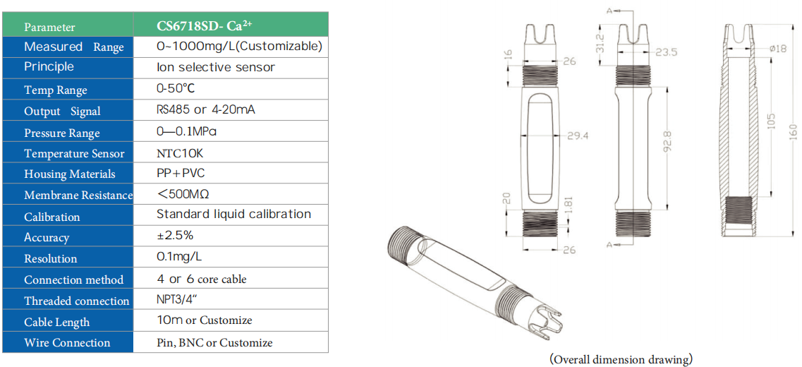 De CS6718SD wordt gebruikt voor de detectie van calcium- en magnesiumionen in verschillende waterlichamen. Een ionselectieve elektrode is een elektrochemische sensor die gebruikmaakt van het membraanpotentiaal om de activiteit of concentratie van ionen in een oplossing te meten. Wanneer de elektrode in contact komt met de oplossing die de te meten ionen bevat, ontstaat er contact met de sensor op het grensvlak tussen de elektrode en het membraan.membraan en de oplossing. Ionactiviteit is rechtstreeks gerelateerd aan de membraanpotentiaal. Ionselectieve elektroden worden ook wel membraanelektroden genoemd. Dit type elektrode heeft een speciaal elektrodemembraan dat selectief reageert op specifieke ionen. De relatie tussen de potentiaal van het elektrodemembraan en het ionengehalte.De te meten waarde voldoet aan de Nernst-formule. Dit type elektrode kenmerkt zich door een goede selectiviteit en een korte evenwichtstijd, waardoor het de meest gebruikte indicatorelektrode is voor potentiaalanalyse.